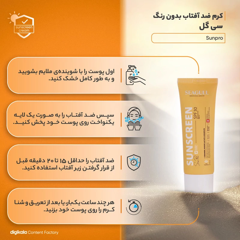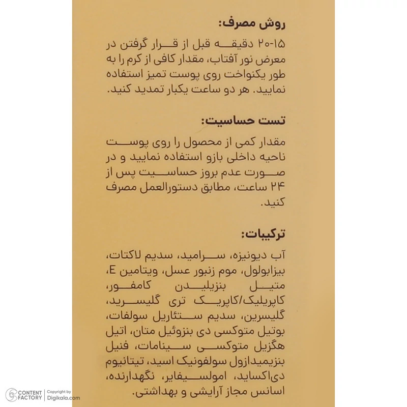 راهنمای استفاده: 30 دقیقه پیش از قرار گرفتن در معرض آفتاب، کرم را بر تمام سطوحی که در تماس مستقیم با نور خورشید قرار میگیرند بمالید. هر دو ساعت یکبار یا پس از شنا کردن یا تعریق زیاد مصرف کرم را تجدید کنید.