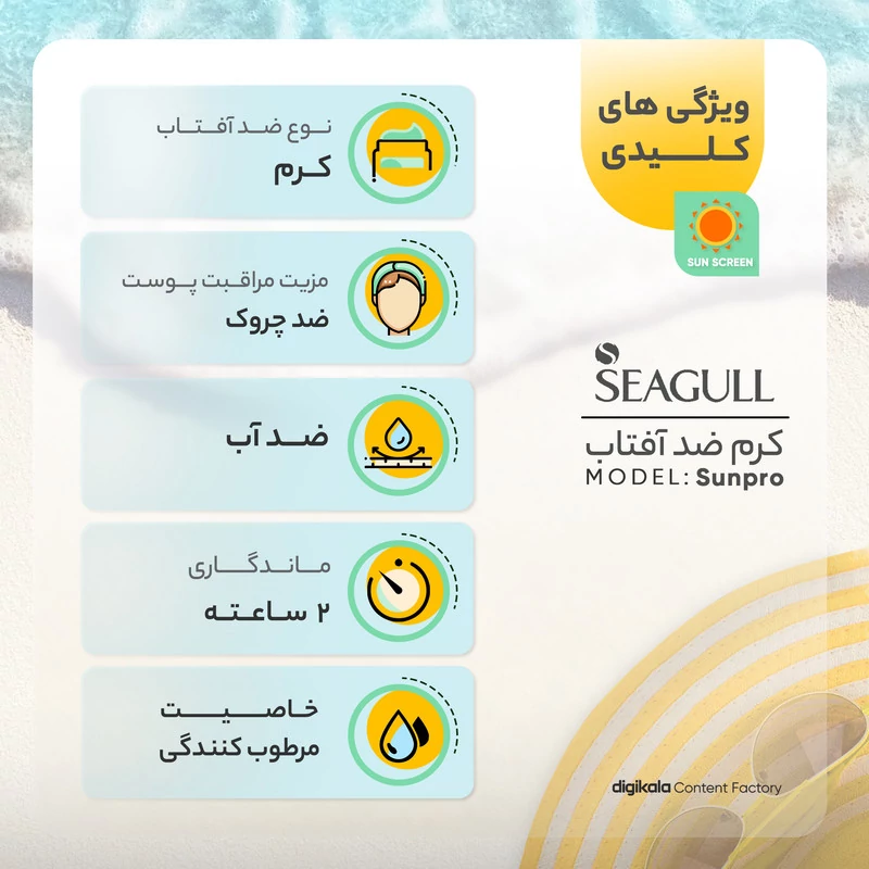 ویژگیهای ضدآفتاب: ضد آب, محافظت کننده در برابر اشعه UVA, محافظت کننده در برابر اشعه UVB, مرطوب کننده