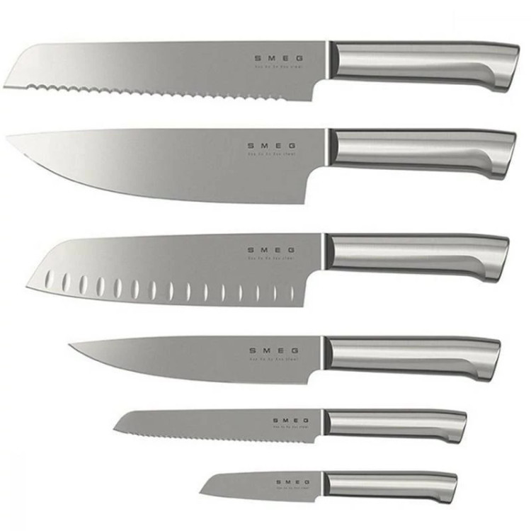 با این ست بلوک چاقو 7 تکه ، استایل کلاسیک SMEG و ظاهری قدیمی دهه 1950 را به میز آشپزخانه خود بیاورید! بلوک چاقوی چوب اقاقیا دارای بدنه بیرونی فولاد کربنی با پوشش پولیش است که به راحتی تمیز میشود و به رنگ کرم براق پوشیده شده است برای هماهنگی با سایر لوازم SMEG رنگ است.پایههای ضد لغزش مانع از لغزش بلوک در هنگام برداشتن چاقو میشوند. چاقوهای این مجموعه دارای تیغه های با کیفیت استیل ضد زنگ آلمانی و دسته های فولادی ضد زنگ صیقلی و بسیار بادوام هستند و برای کارهای روزمره برش انواع مواد غذایی آماده هستند. این مجموعه شامل چاقوی سبزیجات، چاقوی همه کاره، چاقوی گوشت، چاقوی سانتوکو، چاقوی نان و چاقوی آشپز می باشد.