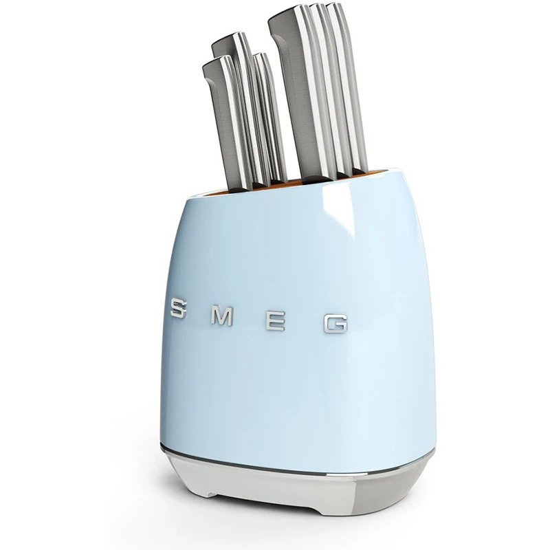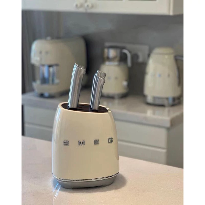 با این ست بلوک چاقو 7 تکه ، استایل کلاسیک SMEG و ظاهری قدیمی دهه 1950 را به میز آشپزخانه خود بیاورید! بلوک چاقوی چوب اقاقیا دارای بدنه بیرونی فولاد کربنی با پوشش پولیش است که به راحتی تمیز میشود و به رنگ کرم براق پوشیده شده است برای هماهنگی با سایر لوازم SMEG رنگ است.پایههای ضد لغزش مانع از لغزش بلوک در هنگام برداشتن چاقو میشوند. چاقوهای این مجموعه دارای تیغه های با کیفیت استیل ضد زنگ آلمانی و دسته های فولادی ضد زنگ صیقلی و بسیار بادوام هستند و برای کارهای روزمره برش انواع مواد غذایی آماده هستند. این مجموعه شامل چاقوی سبزیجات، چاقوی همه کاره، چاقوی گوشت، چاقوی سانتوکو، چاقوی نان و چاقوی آشپز می باشد.