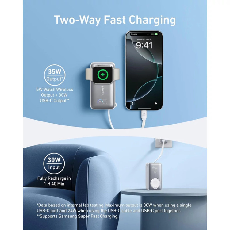 Single USB-C Cable / Port: 30W Max, Watch Wireless Charger: 5W Max/