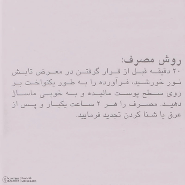 راهنمای استفاده: نيم ساعت قبل از خارج شدن از منزل و يا محل کار به مقدار کافی از فرآورده را بر روي نقاطي از پوست که در معرض تابش نور خورشيد قرار دارند ماليده و به خوبی ماساژ دهيد. اين عمل را هر دو ساعت يکبار تجديد کنيد.