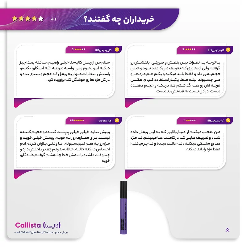 سایر توضیحات: ریمل حجم دهنده کالیستا مدل Extend Volume با رنگدانههای غلیظ، مژهها را پرپشت، بلند و خوشحالت کرده و ماندگاری بالایی دارد. گزینهای ایدهآل برای زیبایی چشمها!
