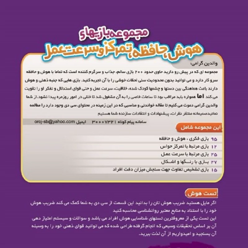 این بازی به صورت لوح فشرده می باشد و مشتمل برحدود 300 بازی با موضوع هوش و حافظه ، سرعت عمل ، تمرکز حواس و.. همراه با آزمون استاندارد تست هوش