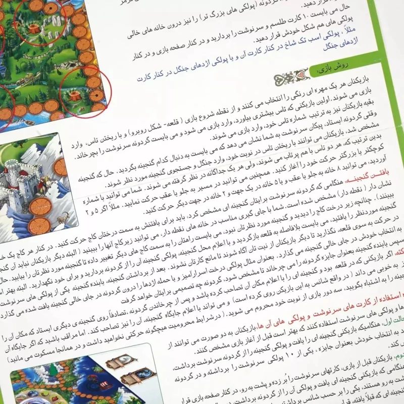 شامل صفحه بازی، کارتها، مهرهها و اشیاء گنجینهای