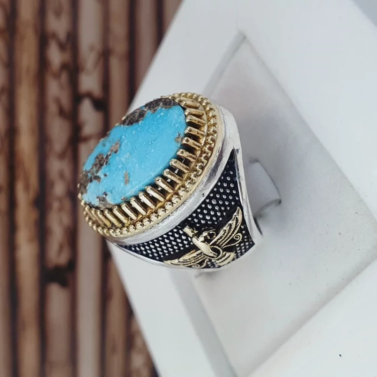 انگشتر نقره 925 عیار استاندارد بقل برنجی طرح فروهر با نگین فیروزه نیشابوری اصل و معدنی کیفیت عالی و استاندارد