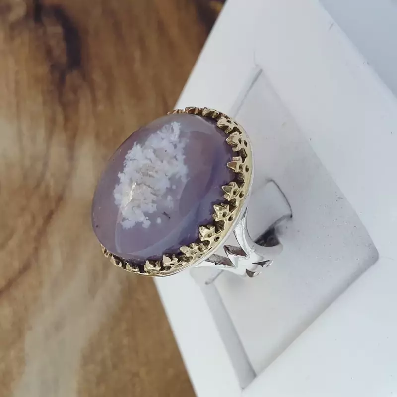 انگشتر نقره زیبای مردانه طرح نیزه چنگ برنجی شکیل با نگین شجر بهاره فردوس اصلی و معدنی وزن حدودی 15 گرم