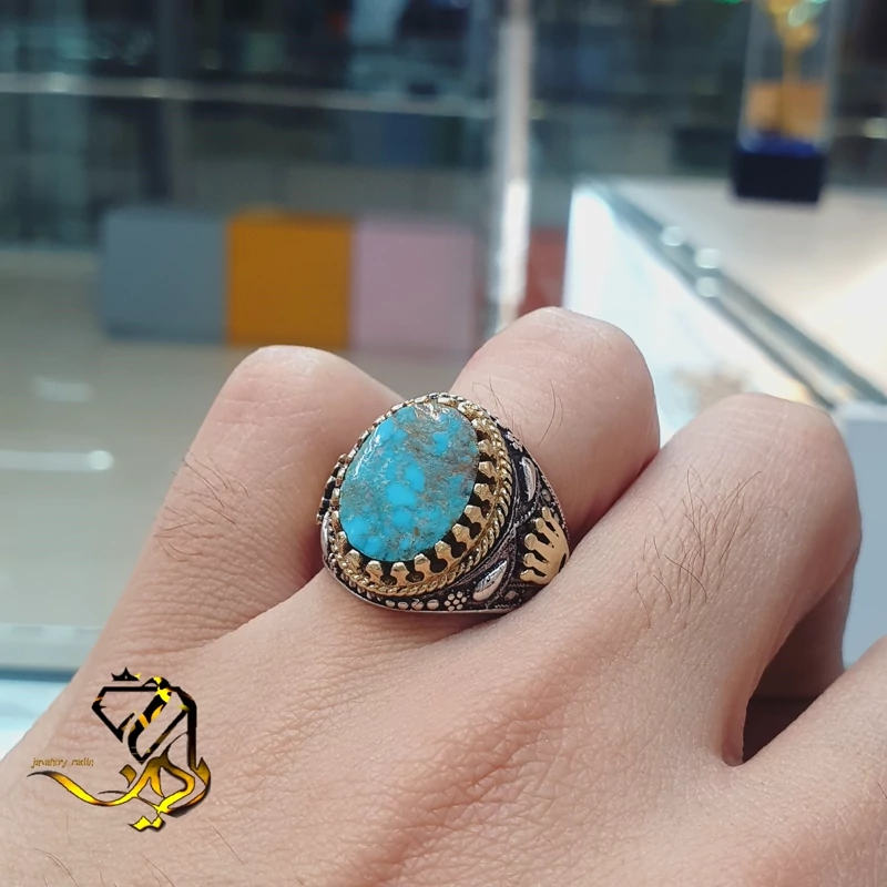 انگشتر نقره 925 عیار استاندارد طرح بقل تاج با نگین فیروزه نیشابوری اصلی و معدنی