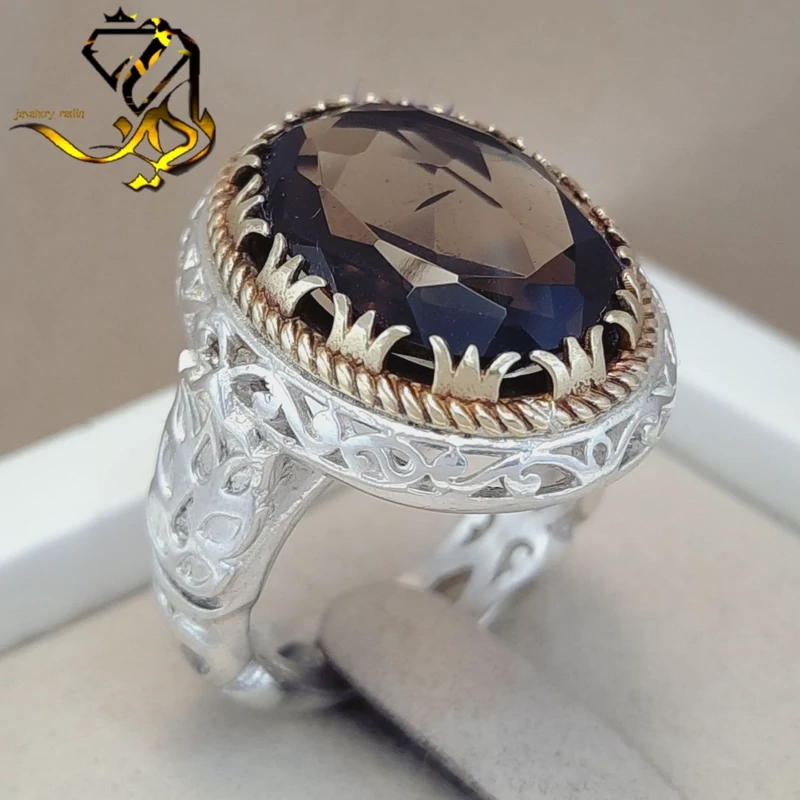 انگشترزیبای نقره مردانه با عیار 925بانگین کوارتز دودی اصلی با رکاب طرح صفوی تاج برنجی وزن حدودی 18 گرم