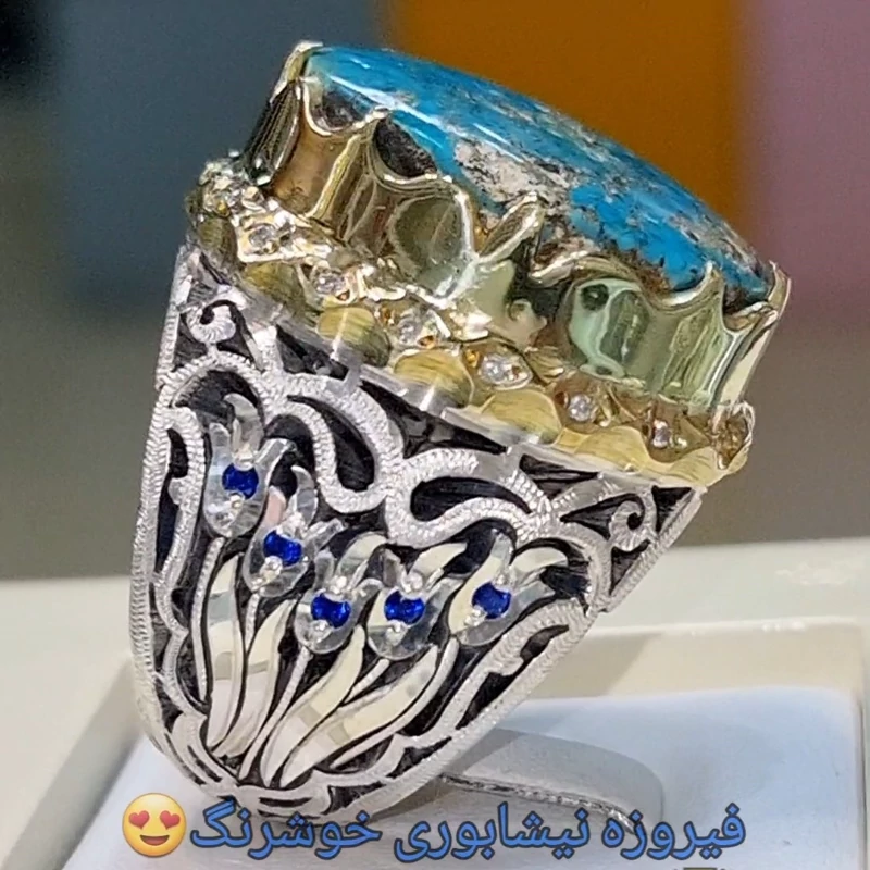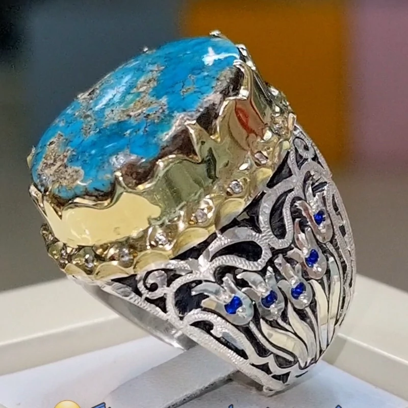 انگشتر خاص نقره 925 عیار تمام دست ساز با نگین فیروزه نیشابوری اصلی و طبیعی