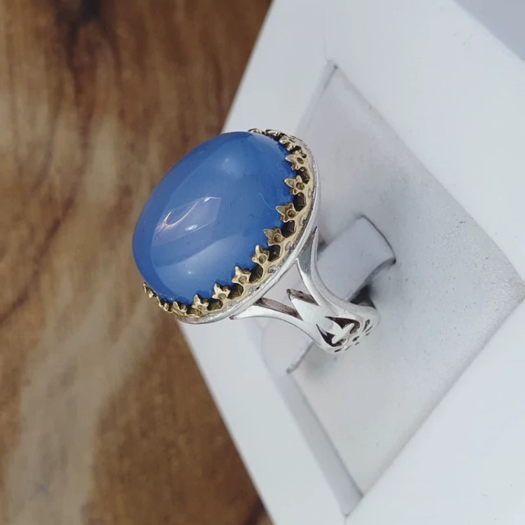 انگشتر نقره زیبای مردانه طرح نیزه تاج برنجی شکیل با نگین عقیق کبود اصلی و معدنی وزن حدودی 12 گرم
