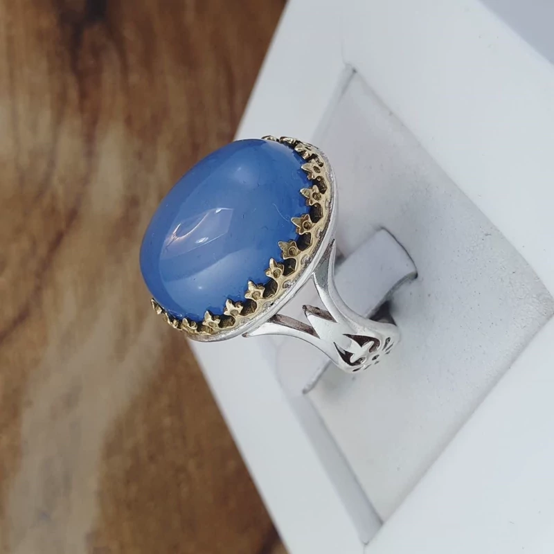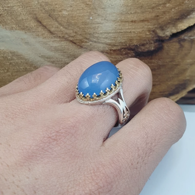 انگشتر نقره زیبای مردانه طرح نیزه تاج برنجی شکیل با نگین عقیق کبود اصلی و معدنی وزن حدودی 12 گرم