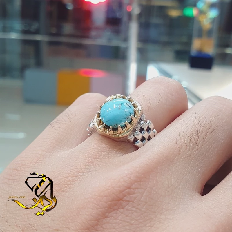 انگشتر نقره 925 عیار استاندارد طرح رولکسی با نگین فیروزه نیشابوری اصلی و طبیعی