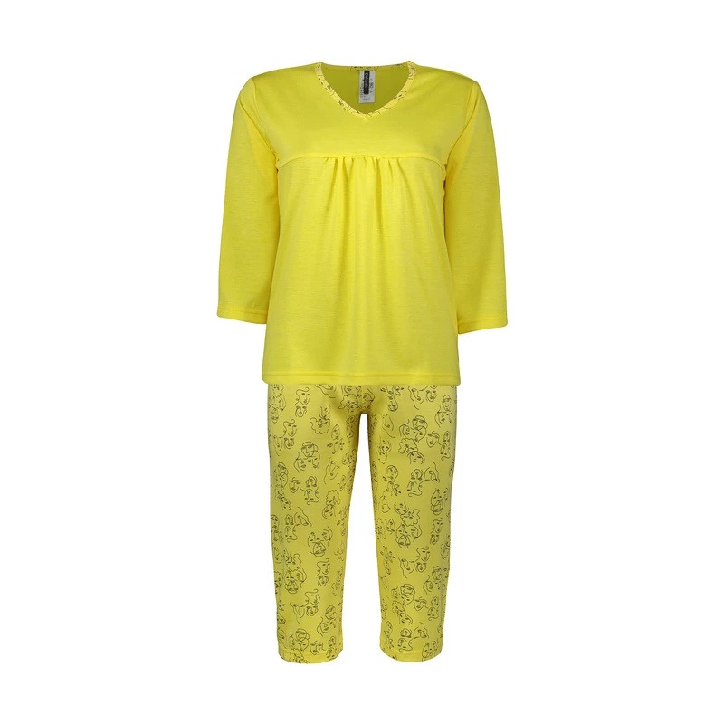 ست راحتی زنانه - تی شرت دارای پارچه ساده - دارای یقه هفت - شلوار با کمر کشی و پارچه طرح دار - مناسب استفاده روزمره