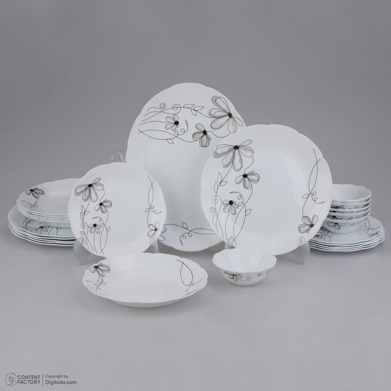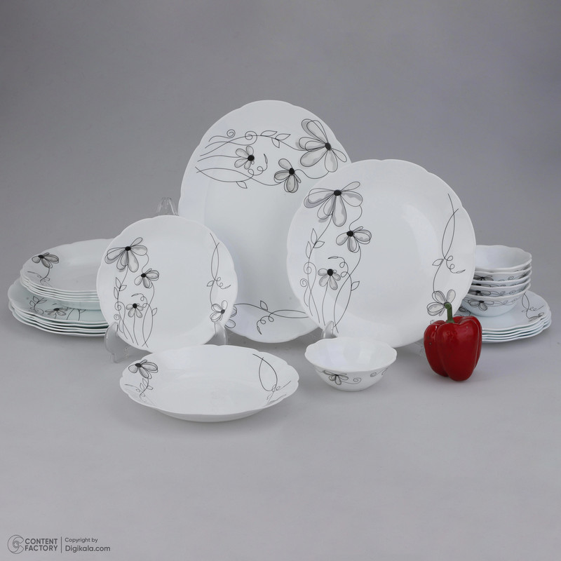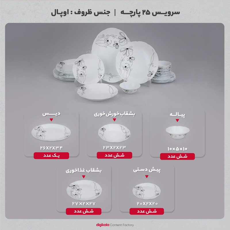 اقلام سرویس: دیس , بشقاب غذاخوری , بشقاب خورشخوری , پیشدستی , پیاله