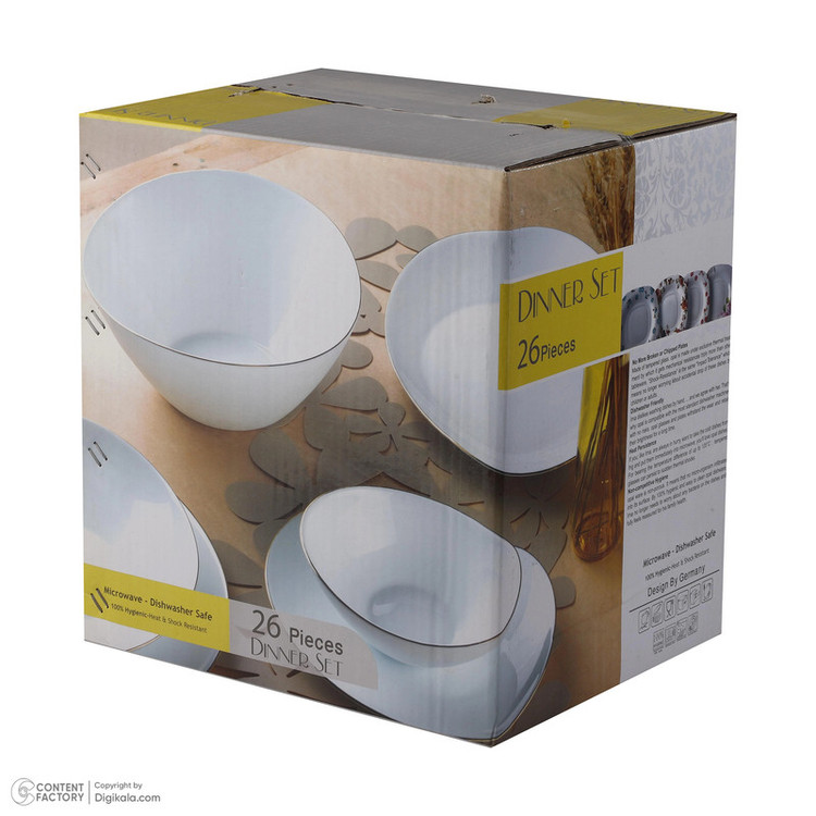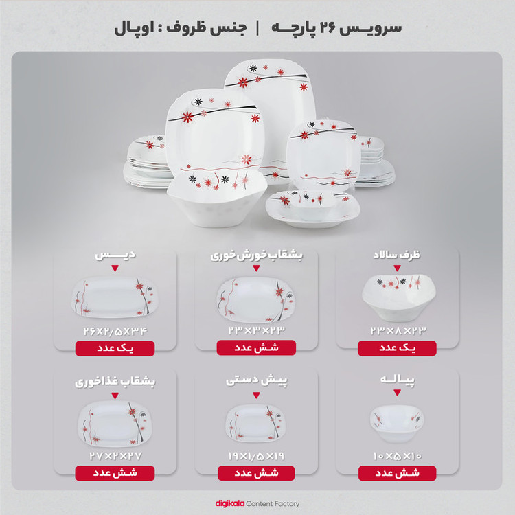 اقلام سرویس: ظرف سالاد , دیس , بشقاب غذاخوری , بشقاب خورشخوری , پیشدستی , پیاله
