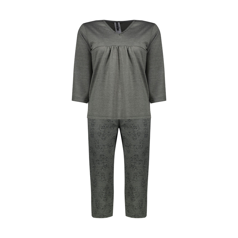 ست راحتی زنانه تی شرت دارای پارچه ساده دارای یقه هفت شلوار با کمر کشی و پارچه طرح دار مناسب استفاده روزمره