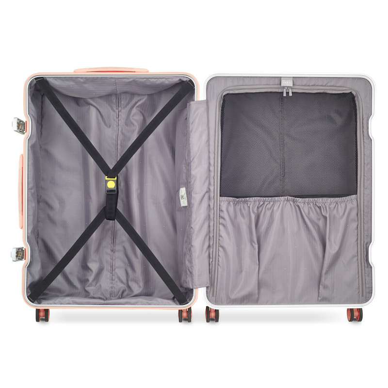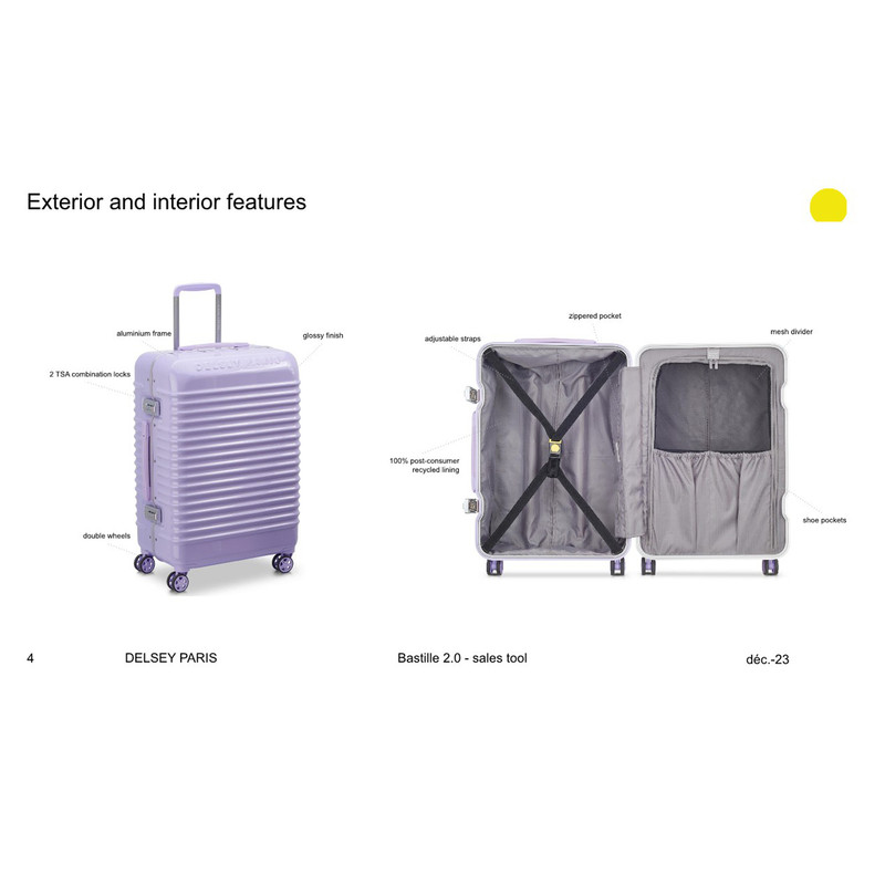 همراه داشتن البسه و لوازم شخصی در هنگام سفر یکی از دغدغههای هر فردی محسوب میشود. شما برای سفر نیاز به انتخاب یک چمدان باکیفیت و در ابعاد مناسب دارید. این ابعاد بستگی به میزان اقامت شما در هنگام سفر است. چمدان دلسی مدل BASTILLE 2.0 نیز از سری چمدانهای مقاوم و کاربردی شرکت دلسی هست .اولین چیزی که در ظاهر هر چمدانی توجه ما را به خودش جلب میکند جنس بدنه است. جنس بدنه چمدانها با توجه به ساخت آنها میتواند سخت یا نرم باشد. پلیکربنات به نسبت دیگر شبه پلاستیکهایی که در ساخت چمدان مورد استفاده قرار میگیرد محکمترین بوده و همین موضوع باعث میشود تا بتوان با خیالی راحت از این محصول برای سفرهای خود استفاده کرد. پلیکربنات شاید به نسبت دیگر پلیمرهایی که در تولید چمدان استفاده میشوند کمی سنگینتر باشد ولی در عوض استحکام بالای آن باعث میشود تا این موضوع اهمیت زیادی نداشته باشد.این چمدان به صورتی استاندارد تولید شده و سه دسته برای حمل و جابهجایی دارد. دو عدد از این دستهها برای حمل دستی چمدان تعبیه شدهاند و در بالا و کنار چمدان قرار دارند. از این دستهها میتوان برای بلند کردن یا قرار دادن چمدان بر روی چرخهای حمل بار، تسمه نقالههای فرودگاه و صندوق عقب خودرو استفاده کرد. دستهی دیگر این چمدان هم در قسمت بالایی آن قرار داده شده است و از ساختاری تلسکوپی بهره میبرد و استفاده از آن کار بسیار سهل و آسانی است. از این دسته میتوان برای حمل راحتتر کیف دستی یا ساکهای کوچک هم بهره برد. در واقع میتوان بند کیف یا ساک خود را به دسته انداخته و آن را به همراه چمدان جابهجا کرد. دستهی تلسکوپی برای جابهجایی چمدان با استفاده از چرخها طراحی شده است. این چمدان دلسی در زیر خود دارای چهار چرخ دوبل بوده که قابلیت چرخشی 360 درجهای دارند و به همین دلیل میتوان به راحتی چمدان را در صورت سنگین بودن هم به سادگی بر روی سطوح هموار جابهجا کرد. این چرخها همچنین به صورتی تولید شدهاند که در زمان چرخش از خود صدایی ایجاد نمیکنند و باعث میشود تا حرکت چمدان بیصدا باشد.امنیت وسایل باعث میشود شما بیشتر بهدنبال چمدانی با قفل بگردید تا از وسایل خود محافظت کنید. دلسی با توجه به همین مسئله برای این چمدان از المان امنیتی بسیار کاربردی قفل TSA استفاده کرده است
