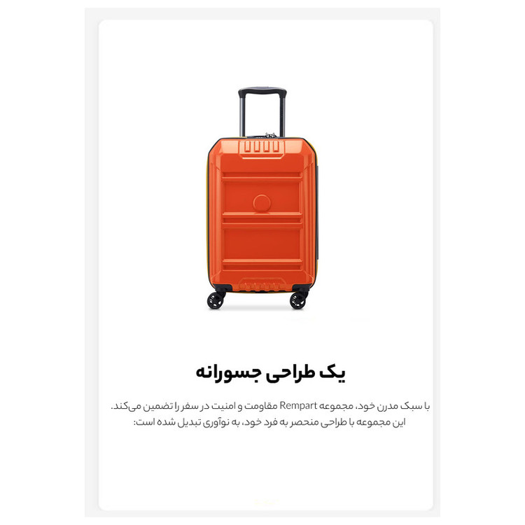 مجموعه REMPART مقطعی از عملکرد و مد، با طراحی براق و قابلیتهای ماژولار روی هم است. صرف نظر از اندازه آنها، هر چمدان را می توان به لطف شیارهای به هم پیوسته پوسته چمدان، روی هم چیده و محکم کرد. پوسته بیرونی از پلی کربنات فوق العاده مقاوم در برابر ضربه ساخته شده است. هر قطعه دارای زیپ SECURITECH® ثبت شده توسط DELSEY است که 3 برابر بیشتر از یک زیپ استاندارد مقاوم است. یک قفل ترکیبی یکپارچه پذیرفته شده توسط TSA به شما امکان می دهد چمدان خود را با استفاده از کد 3 رقمی خود ایمن کنید و به اداره ایمنی حمل و نقل (TSA) اجازه می دهد تا چمدان شما را با استفاده از یک کلید مخصوص باز کند، بدون اینکه به آن آسیبی وارد شود. فضای داخلی برای حداکثر انعطاف پذیری قابل افزایش است و دارای دو محفظه بسته بندی کامل با تسمه های بافته شده و یک جیب زیپ دار در یک طرف، و همچنین یک جداکننده خط دار با دو جیب مشبک در طرف دیگر است. به لطف آستر قابل جابجایی و قابل شستشو، دیگر نیازی نیست نگران ریختن یا کثیفی داخل چمدان خود باشید: زیپ را باز کنید و آن را بشویید تا داخل کیف شما برای سفر بعدی شما کاملا تمیز باشد! این چمدان دارای چرخهای بادوام و بیصدا برای تحرک عالی، و سه دستگیره حمل - در بالا، در کنار و در پایین است - که حداکثر راحتی را هنگام بلند کردن یک کیف کاملاً بستهشده ارائه میکند. این چمدان به گونه ای طراحی شده است که در قسمت هوایی اکثر خطوط هوایی داخلی قرار گیرد.