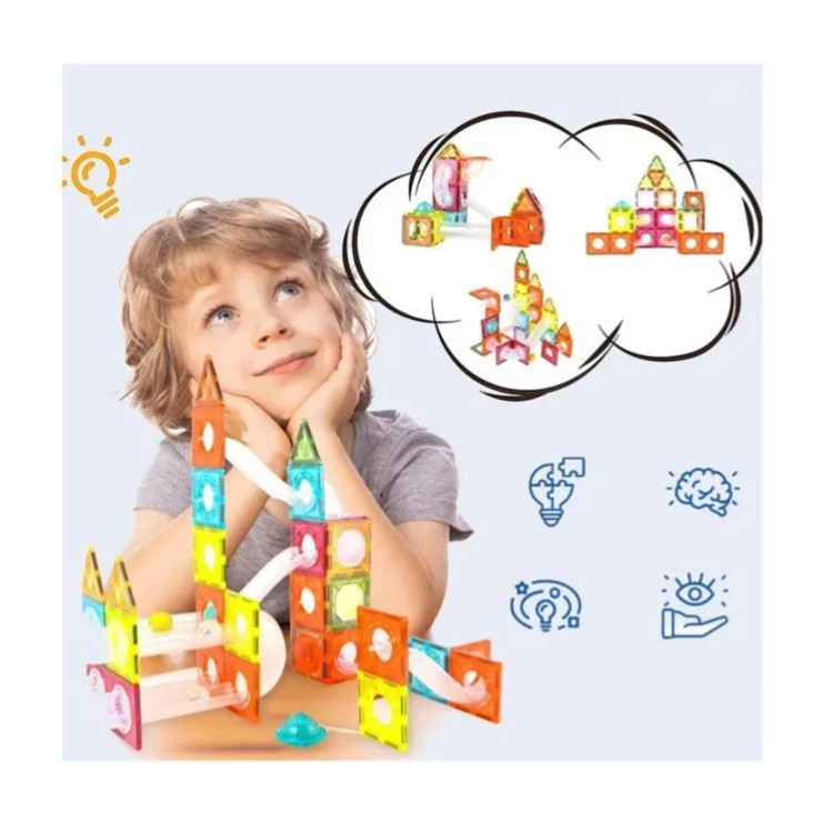 این محصول ترکیبی از سرگرمی + آموزش است و کودکان با استفاده از آهنرباهای قوی داخل قطعات، میتوانند