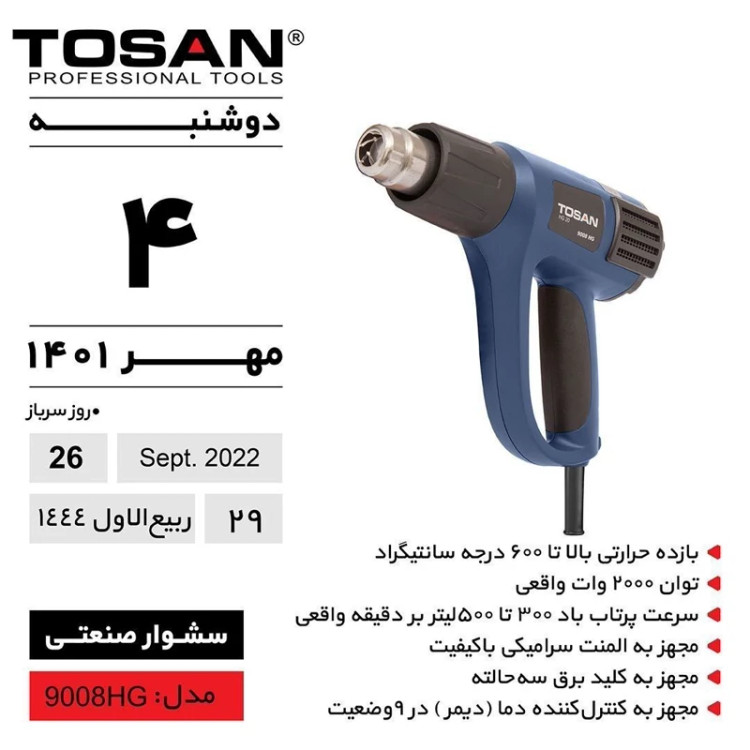 سشوار صنعتی 2000 وات دیمردار توسن مدل 9008HG (12 ماه گارانتی)