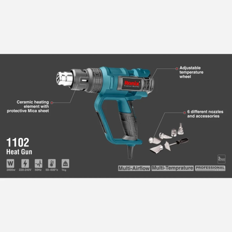 استفاده از باکیفیتترین مواد اولیه در ساخت این ابزار قدرتمند، در کنار بهرهگیری از جدیدترین فناوری روز دنیا و دقت بالا در طراحی بدنه، سشوار صنعتی 1102 رونیکس را به دستگاهی با کیفیت جهانی و انتخاب ایدهآلی در مصارف صنعتی تبدیل میکند. در این بخش، ویژگی2های این محصول بررسی میشود.