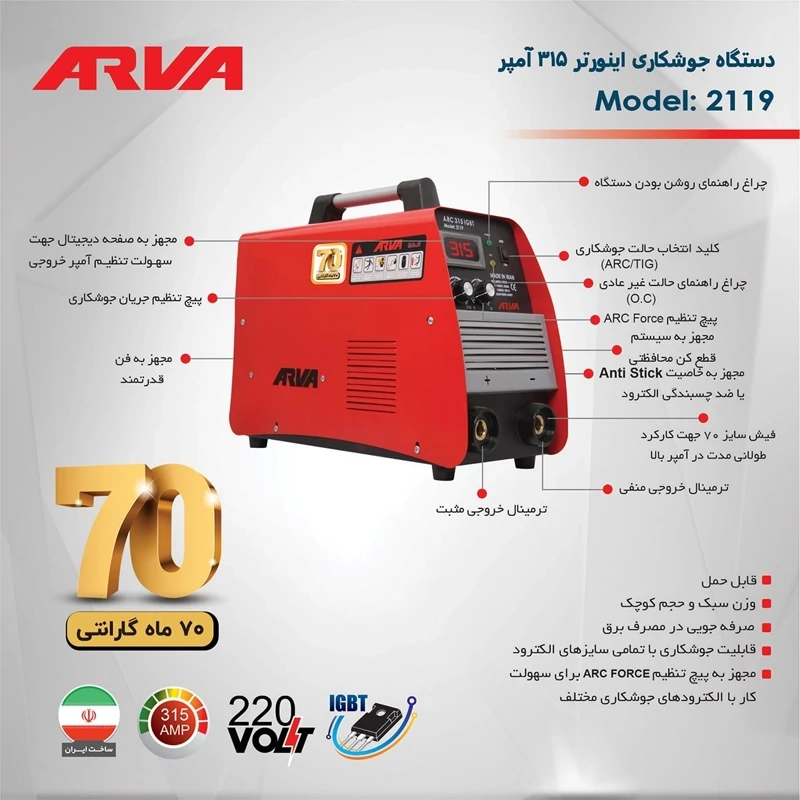 دستگاه جوش 315 آمپر IGBT آروا مدل 2119 (70 ماه گارانتی)(اینورتر جوشکاری)