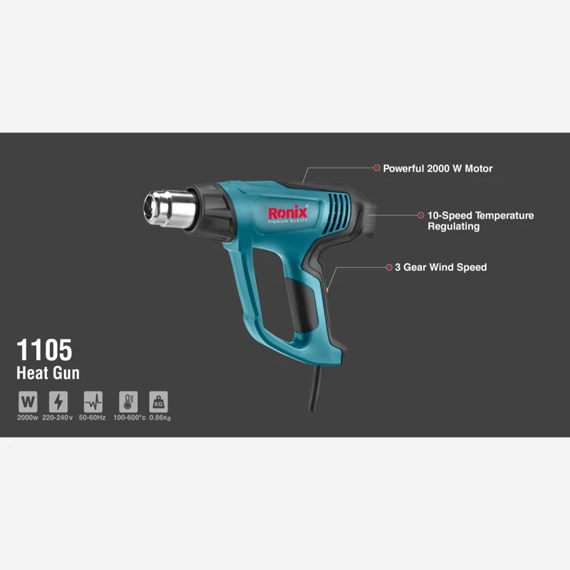 -تفنگ حرارتی قدرتمند 2000 واتی، 3 سرعته با امکان کنترل حرارت متغیر که حداکثر قابلیت کنترل را به ابزار می دهد.