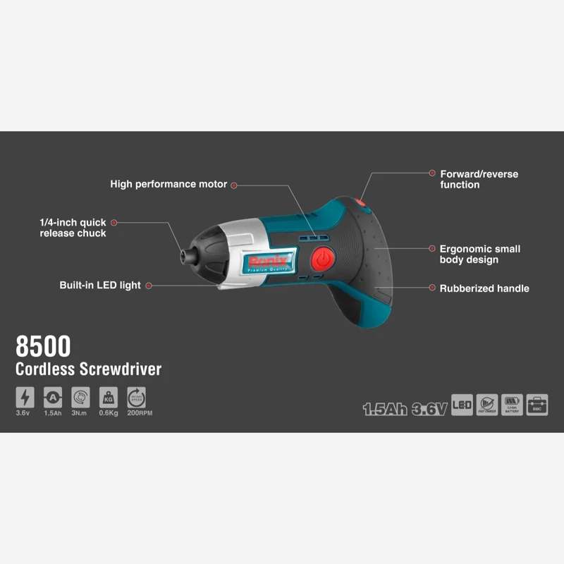 موتور پیچ گوشتی شارژی مدل 8500 رونیکس به عنوان مهمترین بخش تشکیلدهنده آن از عملکردی مطلوب برای باز و بستهکردن پیچ با گشتاورهای مختلف برخوردار است. این موتور نیروی لازم جهت حرکت خود را از طریق باتری لیتیوم یون 3.6 ولت با ظرفیت 1.5 آمپر به دست میآورد تا بتواند ابزارگیر 1/4 اینچی را با سرعت 200 دور در دقیقه به گردش در آورد. این موتور با حداکثر گشتاور 3 نیوتنمتر قدرتی ایدهآل و عملکردی فوقالعاده را ارائه میدهد.