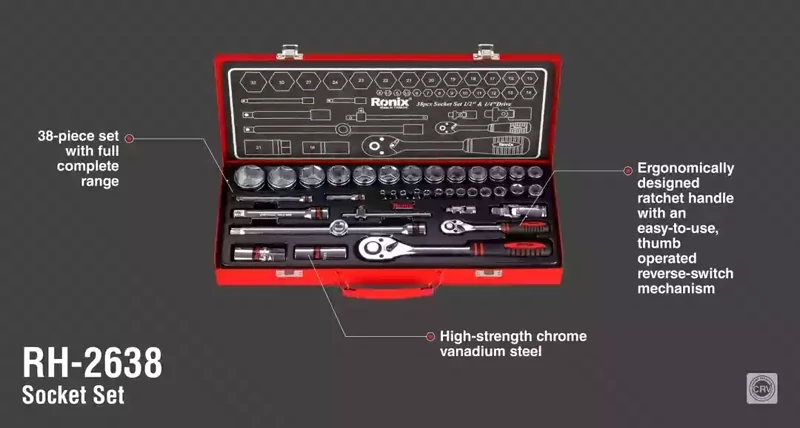 RH-2638 مجموعهای پیشرفته و حرفهای شامل 38 ابزار کاربردی است که با بهرهگیری از تکنولوژی ساخت روز و آلیاژ مقاوم کروم وانادیوم حرارتدیده (فورجشده) تولید شده است. این ست ترکیبی از ابزارهای 1/2 اینچی و 1/4 اینچی را در اختیار شما قرار میدهد تا نیازهای متنوع کاری، تعمیراتی یا DIY را به شکلی کامل برطرف سازد.