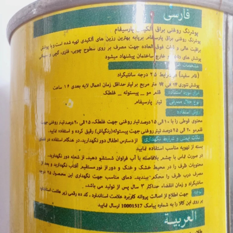 قدرت پوشش: ۱۰ مترمربع به ازای هر کوارت رنگ