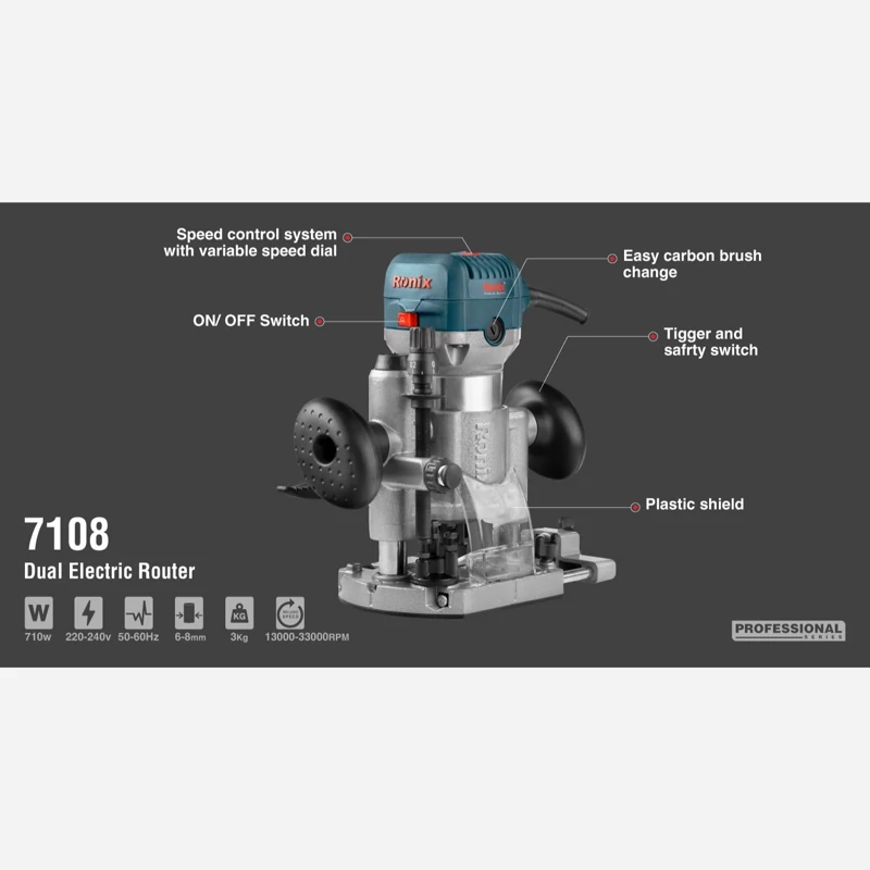 برای انتخاب هر ابزار لازم است ابتدا در مورد برند تولیدکننده، کیفیت و ویژگیهای آن تحقیق کنید تا بتوانید متناسب با نوع کاربری مورد نظر خود، از بین ابزارهای متنوع موجود در بازار، بهترین گزینه را انتخاب کنید. در این بخش، ویژگیهای اور فرز نجاری 7108 رونیکس بیشتر بررسی میشود.