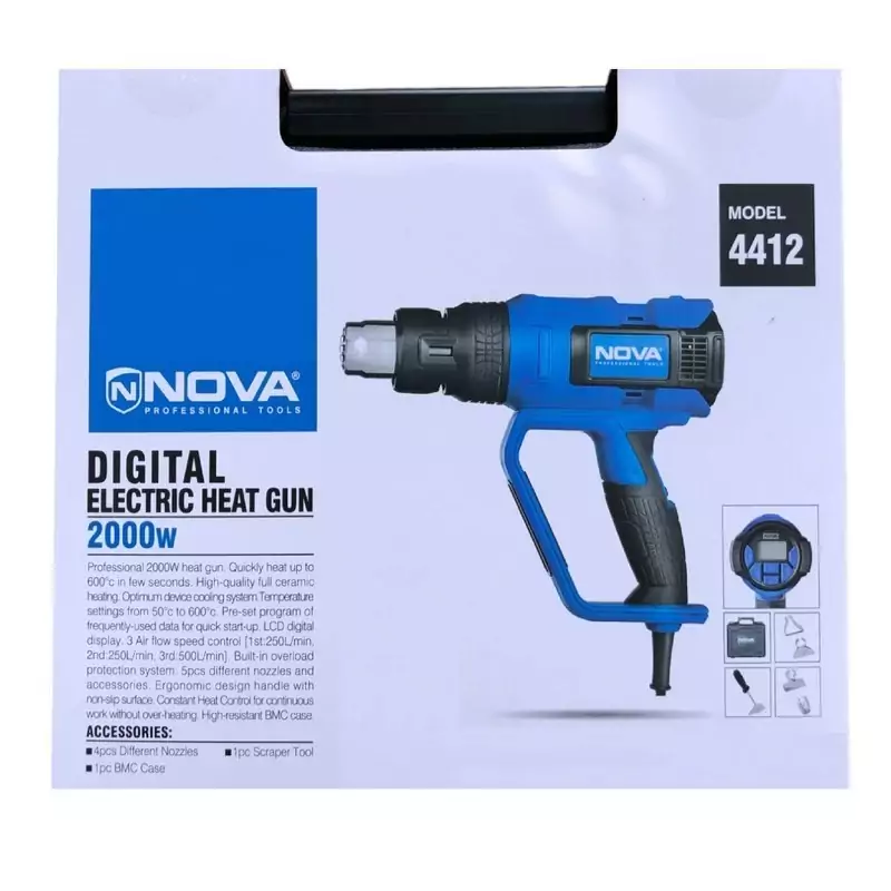 در دنیای امروزی ، تولید ابزارآلات برقی مورد نیاز صنایع مختلف مانند تعمیرات، ساختوساز و… از اهمیت بالایی برخوردار است. کیت سشوار برقی دیجیتال صنعتی 2000 وات نووا با طراحی پیشرفته و عملکرد قدرتمند ، با هدف پاسخی به نیاز بازار به دستگاههایی که بتوانند با دقت بالا و کنترل کامل کارهای حرارتی را انجام دهند ، ساخته شده که از مشخصات و عملکرد قدرتمندی برخوردار می باشد. این محصول یک انتخاب مطمئن برای انجام فعالیت هایی از جمله رنگ زدایی از سطوح ، انحنا دادن به قطعات پلاستیکی ، اتصالات PVC و … بوده و با امکان تنظیم دمای خروجی ، نیاز کاربران را برآورده خواهد کرد.