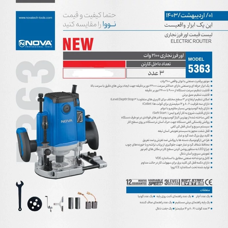 یکی از مشخصات یک ابزار باکیفیت ، رعایت اصول ایمنی در طراحی آن است ، این ابزار دارای قابلیت شروع به کار آرام و ایمن بوده که این امر موجب حفظ سلامتی شما در شروع کار با دستگاه می شود.اور فرز مدل 5363 نووا علاوه بر سه سایز کولت ، به همراه یک عدد آچار ، راهنمای ثابت روی پایه ، پایه راهنمای برش مستقیم ، گونیا ، یک عدد راهنمای صاف کننده و یک جفت ذغال به بازار عرضه می شود و از دیگر ویژگی آن میتوان به حرکت آسان دستگاه بر روی سطح کار، برخورداری از سیستم سریع و آسان قفل کن کفی ، قابلیت تنظیم عمق برش و پایه آلومینیومی اشاره کرد.