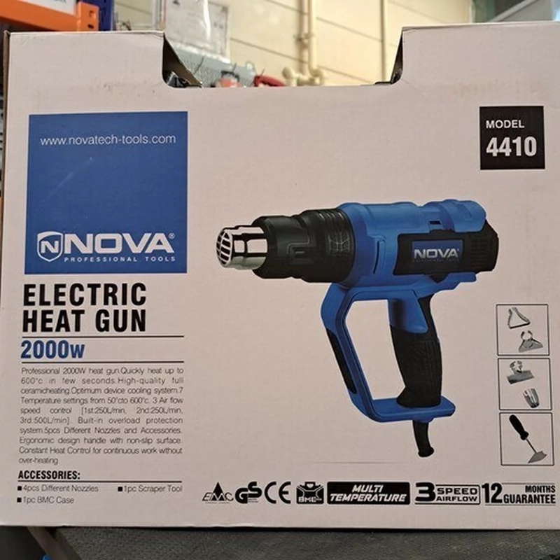 کیت سشوار صنعتی 2000 وات مدل 4410،یکی از محصولات برند نووا می باشد که از بهترین و باکیفیت ترین قطعات تولید می شود.از این دستگاه به منظور رنگ زدایی، ایجاد اتصالات پلاستیکی و PVC، جوشکاری و انحنا دادن به قطعات پلاستیکی و همچنین خشک کردن سطوح و جدا سازی لیبل ها از سطوح استفاده می شود . نازل همراه این دستگاه ، کاربرد های متنوعی دارد.نازل محافظ و دم ماهی برای محافظت از شیشه ها، نازل متمرکز برای رنگ زدایی از لبه ها، درزها و…استفاده می شود.