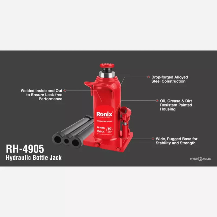 جک روغنی RH-4905 رونیکس میتواند وسایل تا وزن 15 تن را بلند کند. در این جک روغنی از پیچ سختکاریشده برای تنظیم ارتفاع در پایینترین حالت و حداکثر ارتفاع استفاده شده است. همچنین استفاده از خرک دندانهدار سختکاریشده در این ابزار به تنظیم ارتفاع آن کمک میکند. این جک روغنی 15 تنی رونیکس 8.4 کیلوگرم وزن دارد که وزن بسیار مناسبی برای آن است. اما این وزن مناسب باعث افت کیفیت در بدنه این ابزار نشده است. پایه این جک، گسترده و مستحکم است. همچنین تیم خلق محصول رونیکس نقاط تنش بالای این جک را تقویت کردهاند تا دوام بیشتر و مقاومت بالاتری داشته باشد. حداقل ارتفاع این جک 230 میلیمتر است. همچنین، بهکمک اهرم میتوانید پایه این ابزار را 150 میلیمتر بالا ببرید و با پیچ تنظیم ارتفاع میتوانید 80 میلیمتر دیگر هم جسم مورد نظر را بالا ببرید تا حداکثر ارتفاع این ابزار به 460 میلیمتر برسد.