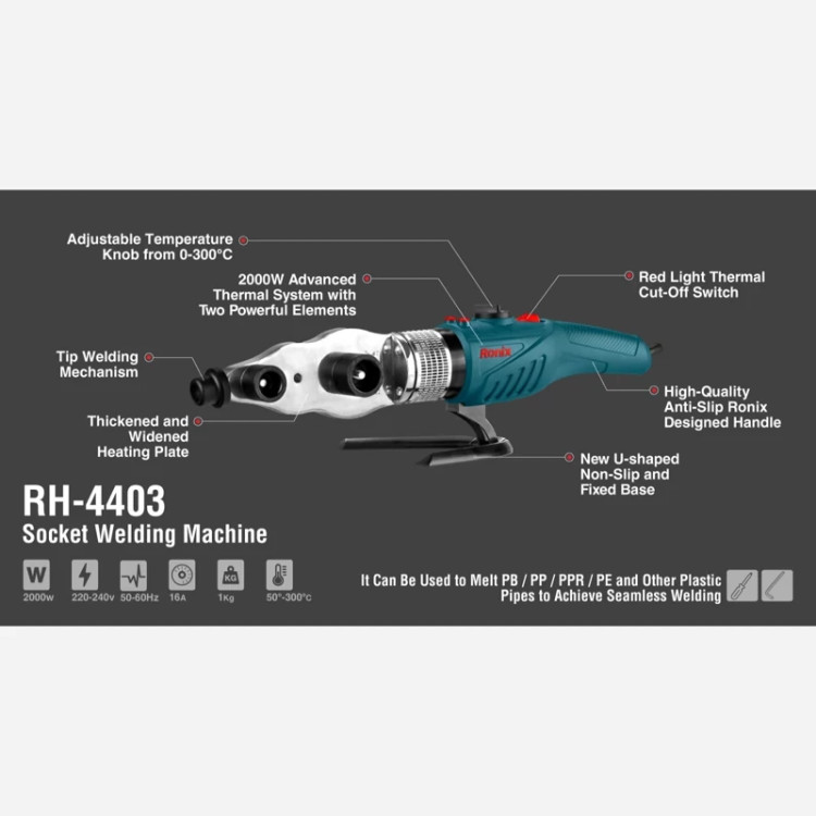 دستگاه جوش لوله سبز RH-4403 رونیکس با وجود مشخصات فنی مطلوب نظیر سیستم حرارتی، ترموستات، عایق، سوکت، راکت حرارتی و طراحی ارگونومیک، یکی از بهترین و قویترین دستگاههای جوش لوله سبز موجود در بازار بوده و عملکرد فوقالعادهای دارد.