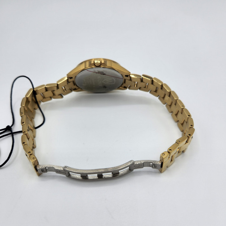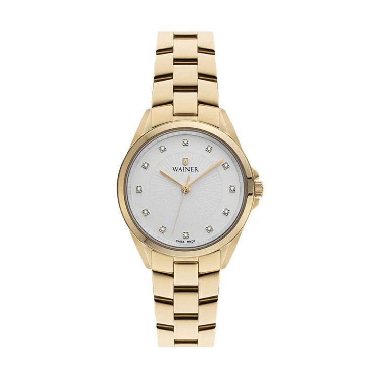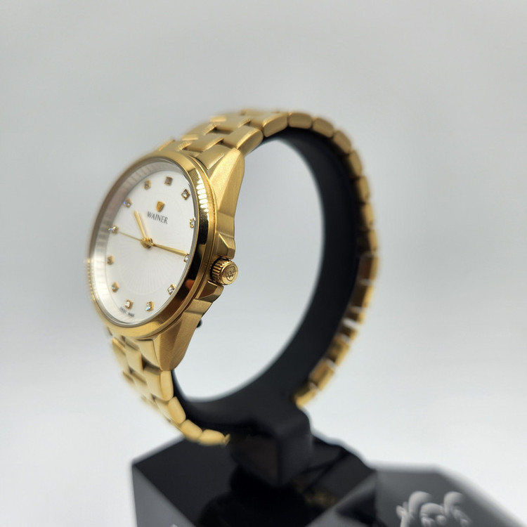 ساعتی زنانه از برند واینر سوئیس با رنگ بندی کامل طلایی و صفحه سفید نگیندار.
