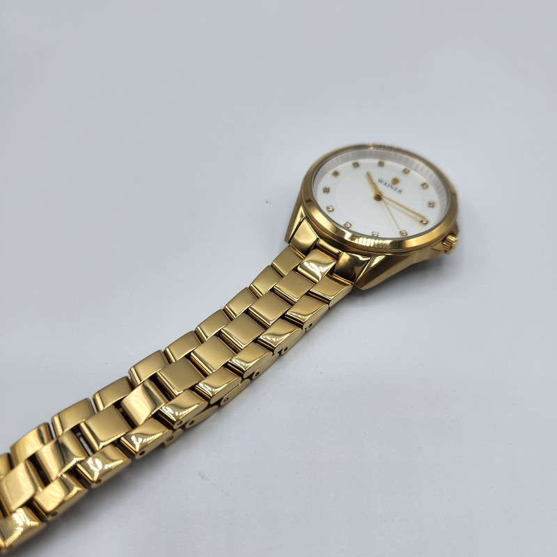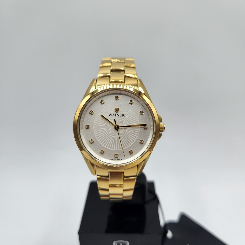 ساعتی زنانه از برند واینر سوئیس با رنگ بندی کامل طلایی و صفحه سفید نگیندار.