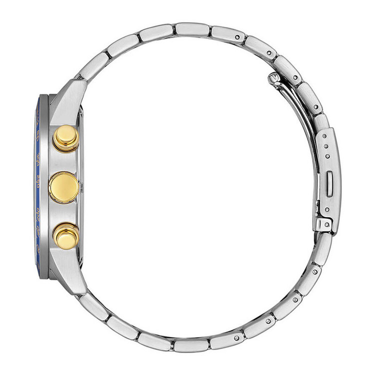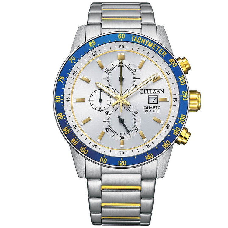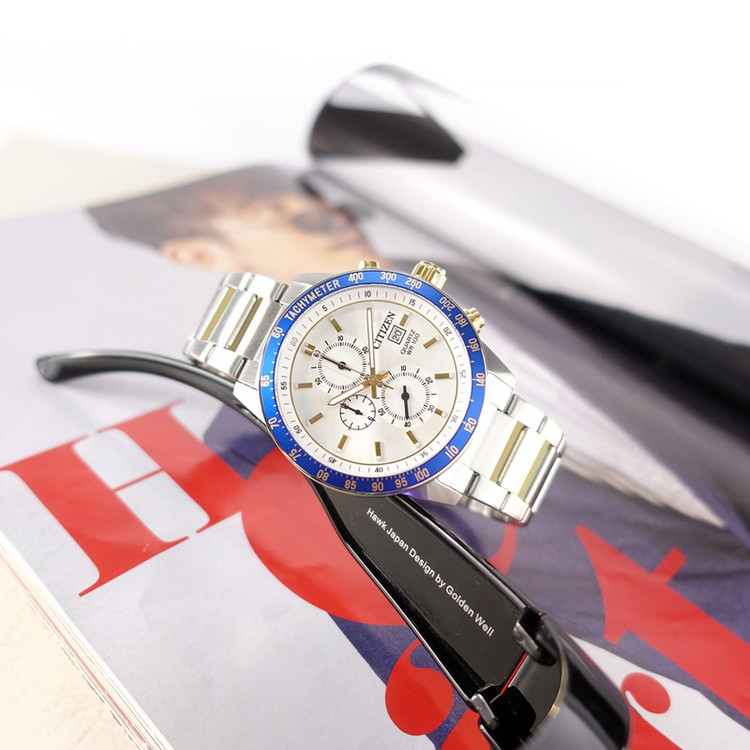 این مدل از ساعت مردانه مچی های برند سیتیزن دارای بند و بدنه استیل با ترکیب رنگهای سرمه ای و نقره ای و طلایی بوده و با صفحه ی خود صاحب ابهت و جذابیت بی نظیری شده است. این ساعت برند سیتیزن کرنوگراف بوده و عقربه های کوچک آن کرنومتر هستند و همچنین دارای نمایشگر روزهای ماه نیز می باشد. این طرح از ساعت های سیتیزن جزو پرفروش ترین ساعت های ژاپنی دنیا به شمار می رود. اعداد دور صفحه ی این طرح از ساعت سیتیزن تاچیمتر هستند و سرعت و شتاب را در فاصله ی یک کیلومتری نمایش میدهند.