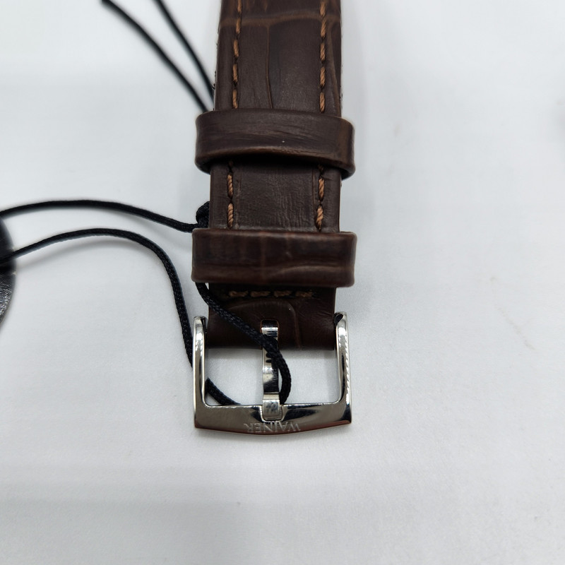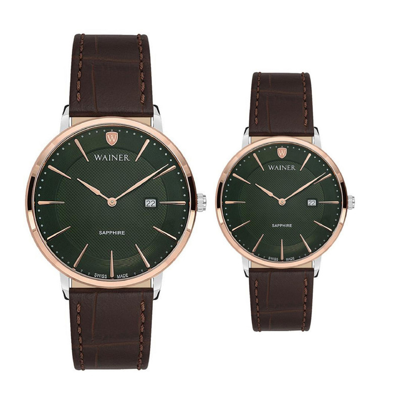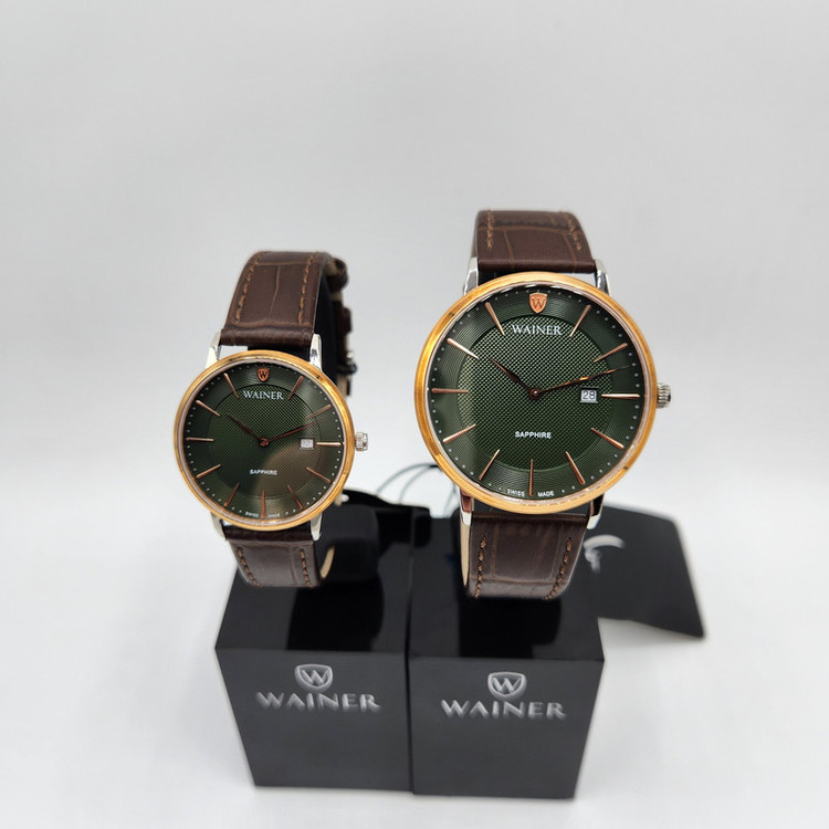 این ست زیبا از معروفترین ساعتهای واینر میباشد که به محض فروش جهانی آن سر و صدای زیادی به پا کرده است. ساعتی بند چرم و کلاسیک با قطر بسیار نازک که درون آن موتور سوئیسی تاریخدار قرار گرفته است. طراحی این ساعت بسیار خاص و زیبا میباشد و در برندهای دیگر میتوانید این ترکیب رنگ را پیدا کنید. ترکیب رنگ سبز تیره در کنار بزل و عقربههای رزگلد پولیش خورده درون ساعت با چرم طبیعی دستدوز قهوهای توانسته نظر هر بینندهای را به خود جلب کند.