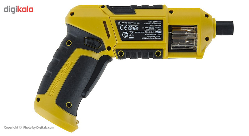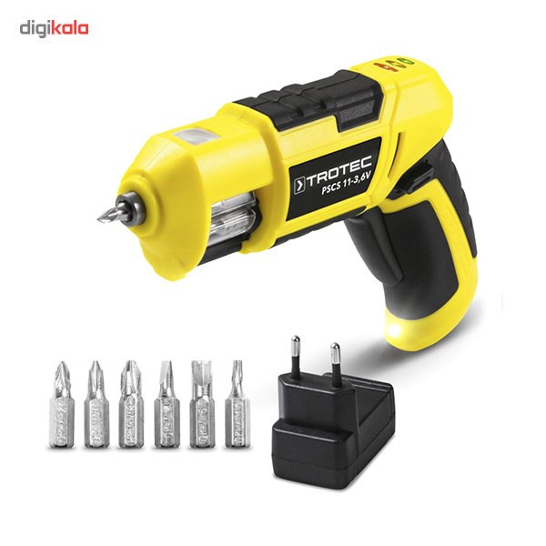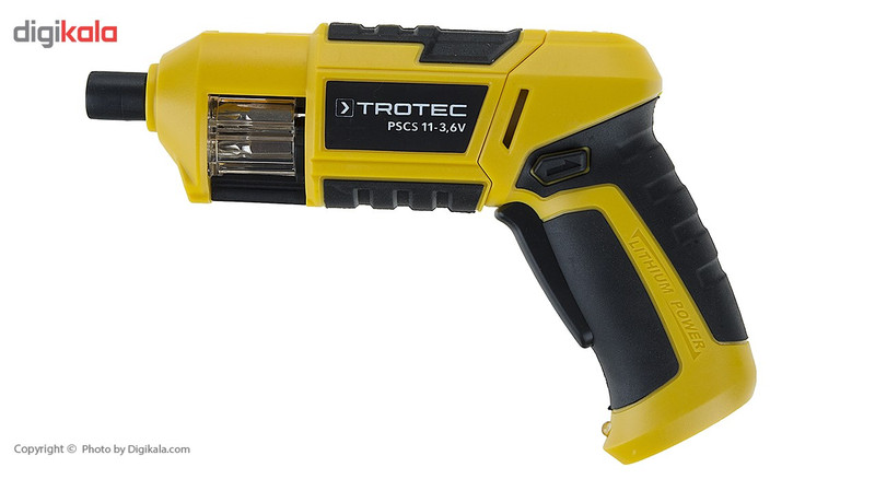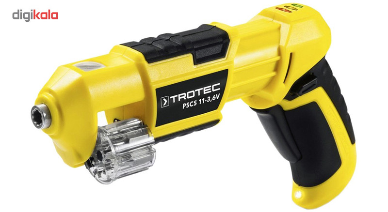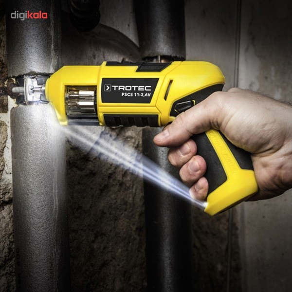 پیچگوشتی فوق مدل «PSCS11-3.6V» نام دارد و یکی از محصولات تولیدی شرکت «تروتک» (Trotec) محسوب میشود. این پیچگوشتی شارژی انرژی موردنیاز خود را از یک باتری لیتیوم-یونی با ظرفیت 1.5 آمپرساعت تامین میکند. یکی از بزرگترین مزایای این محصول قابلیت حمل 6 سری پیچگوشتی است. این دستگاه از خشابی شفاف برخوردار است که میتوان 6 سری پیچگوشتی را درون آن قرار داد و پس از انتخاب سری موردنظر با کمک ذرهبینی که در قسمت بالایی دستگاه قرار دارد، با دستگاه کار کرد. برای تعویض سریها کافی است بدنهی دستگاه را به سمت خارج بکشید و پس از بازشدن آن با دست خشاب را بچرخانید. سریهای این محصول شامل سه سری چهارسو، دو سری دوسو و یک سری ششگوش میشوند. این دستگاه گشتاوری برابر 4 نیوتنمتر دارد و حداکثر سرعت گردش آن 230 دور بر دقیقه است. شرکت تروتک برای روشنکردن سطح موردنظر در حین کار، در قسمت پایینی دسته، یک لامپ الایدی پرنور قرار داده است.