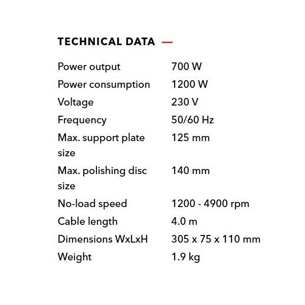 شماره فنی:250280-ساخت آلمان-بازه وسیع سرعت از 1200 تا 4900 دور در دقیقه-ایده آل برای کار با پد قطر 80 تا 140 میلیمتر-دارای میکروپروسسور الکترونیکی تاکو ژنراتور حفظ سرعت زیر بار، شروع نرم، محافظت در برابر بار اضافه و ولوم تنظیم سرعت