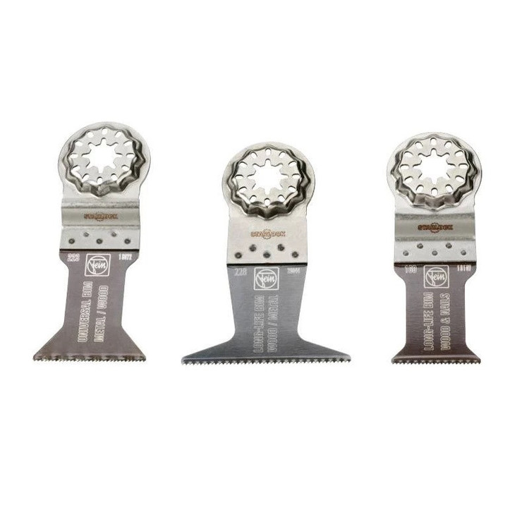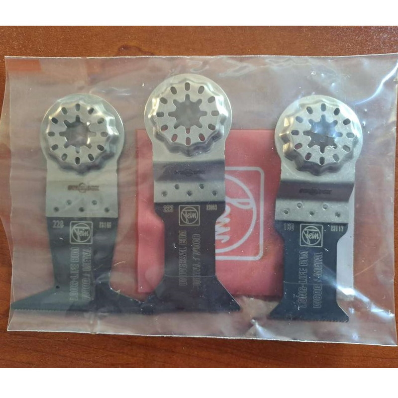 این مجموعه محصول شرکت فاین (FEIN) آلمان شامل یک عدد تیغه برش چوب و فلز مدل E-Cut long-life عرض 35 میلیمتر، یک عدد تیغه برش چوب و فلز مدل E-Cut long-life عرض 65 میلیمتر و یک عدد تیغه برش چوب و فلز مدل E-Cut universal عرض 44 میلیمتر می باشد.