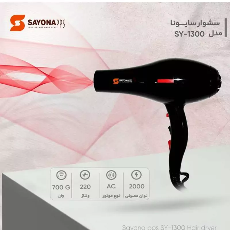 سشوار سایونا مدل SY-1300 با توان 2000 وات یکی از سشوارهای قیمت مناسب بازار است که در کنار داشتن قیمتی پائین، امکانات بسیار خوبی را به مخاطب خود ارائه میدهد. این سشوار تحت نظر شرکت سایونا طراحی و تولید شده که همواره سشوارهای مختلفی با کارایی بالا را عرضه کرده است. توان این سشوار 2000 وات بوده و موتور آن هم از نوع AC است که به شما اجازه خواهد داد برای مدت زمان طولانی، بدون افت کارایی آن را روشن نگه دارید. روشن نگه داشتن سشوار گزینهای است که برای سالنهای زیبایی از اهمیت زیادی برخوردار است. این سشوار در تمامی روز شما را همراهی خواهد کرد.
