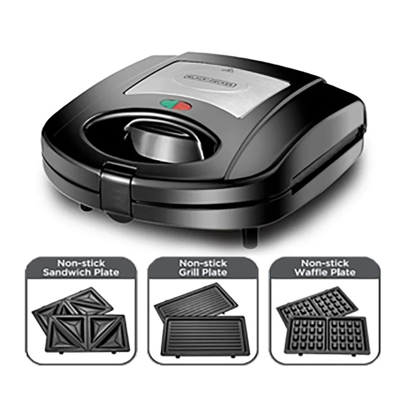 سایر توضیحاتتوان مصرفی 780 وات، دارای شش صفحه شامل: دو عدد ساندویچ ساز، دو عدد وافل ساز و دو عدد گریل، صفحات جداشو و قابل شستشو