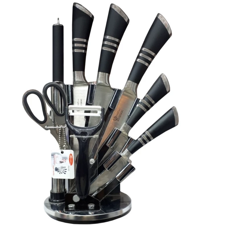 - ست چاقوی ۹ پارچه شامل: - یک پایه گردان از جنس پلاستیک به ارتفاع ۱۵.۵ و قطر ۳۵.۵ سانتیمتر - ابعاد قیچی: ۱۸.۵ × ۷ سانتیمتر - ابعاد چاقو تیزکن: طول کلی ۲۹.۵ و طول تیغه ۱۸.۵سانتیمتر - ابعاد ساطور: طول کلی ۲۹.۵ ، طول تیغه ۱۷ و عرض تیغه ۷.۵ سانتیمتر - چاقو برش سایز ۱: طول کلی ۳۴، طول تیغه ۲۰ و عرض تیغه ۴ سانتیمتر - چاقو برش سایز ۲: طول کلی ۳۴، طول تیغه ۲۰ و عرض تیغه ۲.۵ سانتیمتر - چاقو برش سایز ۳: طول کلی ۲۳.۵، طول تیغه ۱۱ و عرض تیغه ۲.۲ سانتیمتر - چاقو برش سایز ۴: طول کلی ۲۰.۵، طول تیغه ۸.۷ و عرض تیغه ۲ سانتیمتر - یک عدد پوستکن پلاستیکی