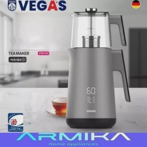 چای ساز با کیفیت وگاس مدل 1335 💠 *چایساز برقی سرهمی هوشمند وگاس مدل vtm-1335 🔖 *درباره محصول* توان مصرفی 2200 وات ظرفیت کتری 1.7 لیتر ظرفیت قوری 1 لیتر جنس کتری استیل ضد زنگ جنس قوری شیشه پیرکس نوع پنل لمسی کفی strix( این قطعه باعث میشود درصورت آب رفتن در کفی دچار سوختگی نشود