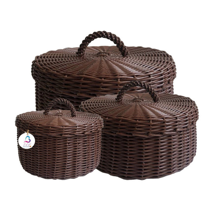سبد حصیر بافی کلبه بلوط مدل نارین یک ست سبد دستبافت می باشد که توسط بانوان هنرمند طرقبه بافته می شود این سبد دستبافت از حصیر های مصنوعی که از جنس پلاستیک در رنگ بندی مختلف و طرح های زیبا بافته می شود از این سبد می توان به عنوان نگهدارنده نخ و سوزن , لوازم آرایشی استفاده کرد