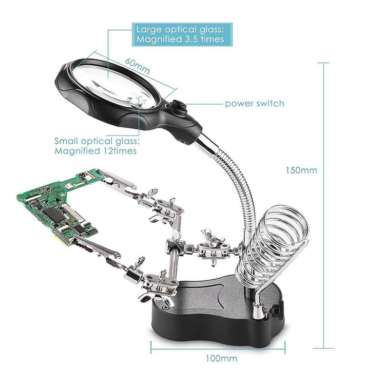 دارای ذره بین 12x(کوچک) و 3.5x(اصلی) مجهز به LED تغذیه با باتری(بدون باتری همراه) به ابعاد تقریبی کالا در البوم عکس ها مراجعه نمایید